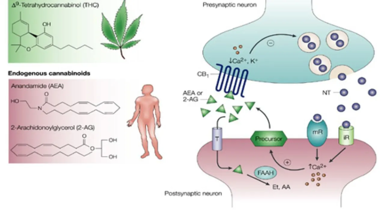 The ECS could be compared to your brain’s climate control. When too much activity is occurring in the brain your ECS kicks in and quiets this activity, bringing levels back to base line. This eCB signaling occurs in a retrograde (backwards) fashion meaning the eCB is released from the post-synaptic neuron and acts on the cannabinoid receptors of the pre-synaptic neuron. Ultimately, this leads to an overall decrease in neurotransmitter release, quieting this activity.